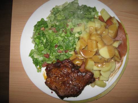 Menu 1: Salade met gekookte aardappelen en een procureurslapje.