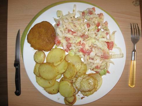 Menu 2: Salade met gebakken aardappelen en een kipschnitzel.